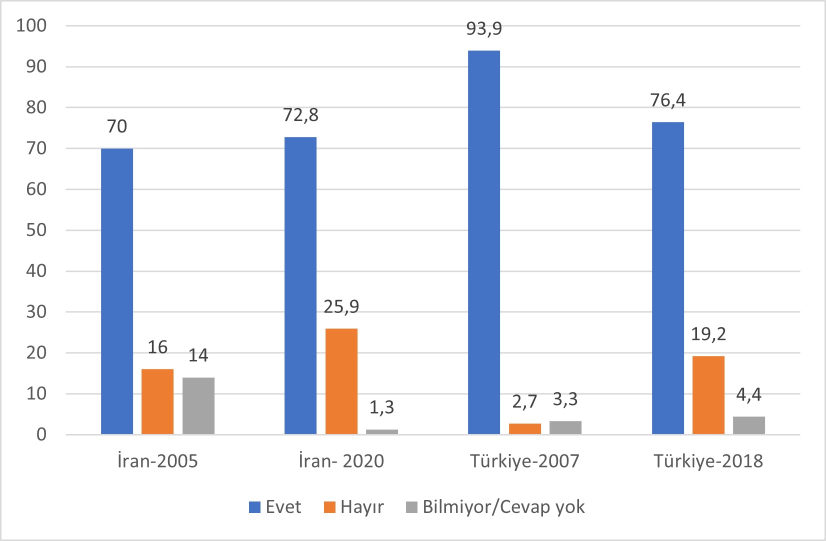 Fakat bildiğimiz bir şey var ki, İranlılar da aynı bizim gibi ülkesi için gerektiğinde savaşmayı göze alabilen bir millettir. Saygın Batılı üniversitelerdeki araştırmacıların düzenlediği Dünya Değerler Anketi’nin İran’da 2005’te 2667 kişiyle, 2020’de ise 1499 kişiyle yaptığı anket verileri önemli bir fikir vermektedir. Aynı anket kapsamında Türkiye’den de 2007 yılında 1346 kişiden, 2018 yılında da 2415 kişiden veri toplanmıştır. Anket kapsamında kişilere savaş olması halinde ülkeleri için savaşıp savaşmayacakları sorulmuştur. Bu soruya evet, hayır veya bilmiyorum diye cevap vermek veya hiç cevap vermemek mümkündür. Bu soruya verilen cevaplardan oluşturduğum grafiğe baktığımızda İranlıların 2005 yılından 2020 yılına kadar ülkeleri için savaşmaya evet diye yanıt vermeleri %70 civarında seyretmiştir. İran’da birçok protestolar olmasına rağmen bu soruya evet diyenlerin oranının düşmeyip aksine bir miktar artıyor olması ilginç bir sonuç.